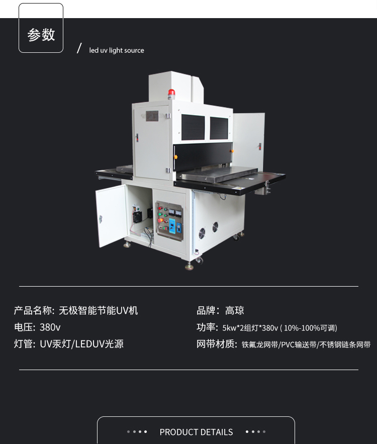 產(chǎn)品規(guī)格:生產(chǎn)廠家:高瓊產(chǎn)品名稱:無極智能節(jié)能UV機電 壓:380V功 率:5kw*2組燈功率調(diào)節(jié):10%-100%燈 管:UV汞燈/leduv光源網(wǎng)帶材質(zhì):鐵氟龍網(wǎng)帶/PVC輸送帶